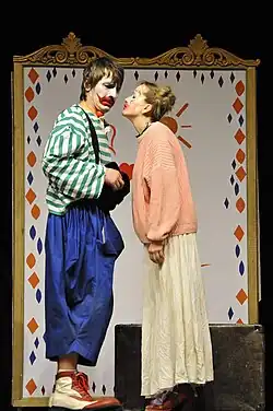 The National Theatre is initiator of many festivals and events that increase the competition between performers and performing arts institutions. The first competition was arranged in the beginning of the 50s and resulted in the collection of original dramas of different kinds with no language restrictions. The results were quite satisfactory because many of the dramas were turned into great shows like “Erveheja”, “Dashuria” and “Hakmarrja”.[10] Except for original dramas, in stage were performed many books by Albanian famous authors. One of them which was very successful was “Sikur të isha djalë” by Haki Stërmilli. In 60s and 70s many authors started writing dramas which would enrich the repertoire of the National Theatre. The basics of dramatic creativity were established with the permanent competition “Katarina Josipi-KATI” which holds the name of the famous actress Katarina Josipi. This competition brings on stage many art pieces which have a large number of audience members and fill the gaps of theatrical creativity in the National Theatre.[11] Except for different kinds of dramas, in stage were put even some poems like “Zogu i diellit” by Din Mehmeti and “Trungu Ilir” by Sabri Hamiti.[12][13]
