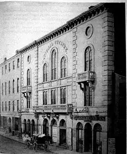 The National Theatre (1836-1863) was a theatre in the West End of Boston, Massachusetts, in the mid-19th century.[1][2] William Pelby established the enterprise in 1836, and presented productions of "original pieces, and the efforts of a well selected stock company, which, with few exceptions, have been American. The scenery is of the highest order, and the business of the stage well directed. Mr C.A. Eaton made his debut at this theatre, and here Mr. F.S. Hill's early labors were eminently successful. Mr. J.S. Jones has written and produced on this stage thirty pieces, embracing every department except tragedy."[3] William Washburn designed the building, erected on the site of the former Warren Theatre. Performers at the National included Edwin Adams, Marietta Zanfretta, Jean Margaret Davenport,[4] Julia Dean, Jonathan Harrington, W.H. Smith,[5] Mary Ann Vincent, and Billy Whitlock. In 1852 the theatre burnt down, and was rebuilt.[6] In 1863 the building was again destroyed by fire.[7]