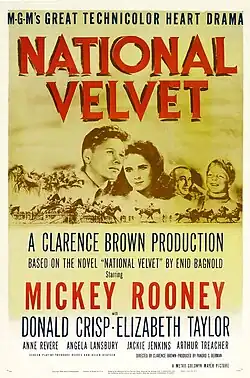 National Velvet is a 1944 American Technicolor sports film directed by Clarence Brown and based on the 1935 novel of the same name by Enid Bagnold, about a young English girl who rides a racehorse. It stars Mickey Rooney, Donald Crisp, Angela Lansbury, Anne Revere, Reginald Owen, and an adolescent Elizabeth Taylor.[2][3]