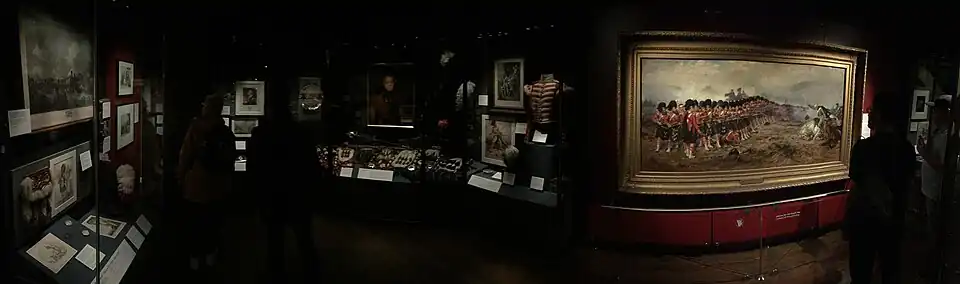 The museum's collection includes items used by Scotland's armed forces over many centuries. These include broadswords from the Scottish Highlands, protection against chemical warfare, and letters sent home from combat by personnel. It also houses a gallery, with works such as The Thin Red Line by Robert Gibb, and a library.[4]
