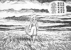 Among the inspirations for the environmental themes Miyazaki has mentioned the Minamata Bay mercury pollution. The Sea of Corruption is based on the forests on the Japanese island of Yakushima and the marshes of the Sivash, or Rotten Sea, in Ukraine.[19][c] The works of botanist Sasuke Nakao were among Miyazaki's inspirations for the environment of the story. Miyazaki mentions Nakao in the context of a question he was asked about the place Nausicaä takes in the ecology boom, explaining his shift from a desert to a forest setting. Nakao's influence on his work has been noted by Shiro Yoshioka.[21] Miyazaki has identified Tetsuji Fukushima's Sabaku no Maō 沙漠の魔王 (The Evil Lord of the Desert), a story he first read while still in primary school, as one of his earliest influences. Kentaro Takekuma has also observed this continuity in Miyazaki's work and places it within the tradition of illustrated stories, emonogatari (絵物語), and manga Miyazaki read while growing up, pointing out the influence of Fukushima on Miyazaki's People of the Desert which he in turn identifies as a precursor for both Shuna's Journey, created in watercolour and printed in colour, and Nausicaä.[22]