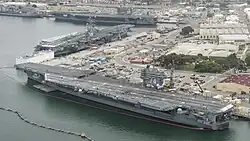 Three US Navy Nimitz-class aircraft carriers, USS Carl Vinson (CVN-70), USS Ronald Reagan (CVN-76), and USS John C. Stennis (CVN-74) pierside at NAS North Island during June 2015 | |||||||||