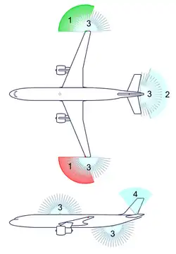 Aircraft navigation lights follow the convention of marine vessels established a half-century earlier, with a red navigation light located on the left wingtip leading edge and a green light on the right wingtip leading edge. A white navigation light is as far aft as possible on the tail or each wing tip.[7] High-intensity strobe lights are located on the aircraft to aid in collision avoidance.[8] Anti-collision lights are flashing lights on the top and bottom of the fuselage, wingtips and tail tip. Their purpose is to alert others when something is happening that ground crew and other aircraft need to be aware of, such as running engines or entering active runways.