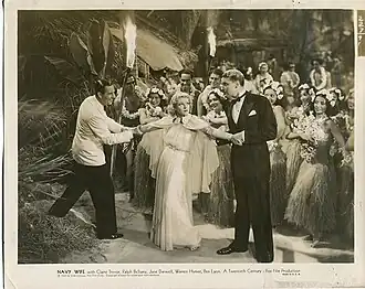 Allan Dwan said that the film had nothing from the novel.[4] The Fox Film Corporation joined with Twentieth Century Pictures as the film was entering production in Hawaii.[4] The film's exteriors were shot in Hawaii while a few scenes happened at the San Diego Naval Training Station Hospital.[1] Ben Lyon was surprised about signing a contract for the film due to not having a lead role for a while. Navy Wife was the first film that deals with life as part of the Navy Nurse Corps and Medical Corps of the United States Navy.[5] A short feature about the science behind manufacturing and a newsreel were shown alongside the film during its theatrical run.[6]