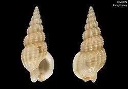 (Original description in Latin) The shell appears shiny and translucent. The spire is elevated and lurid. There are 8.5 whorls; the apical 1.5 are smooth. The 7 normal whorls are rounded, separated by an impressed suture (the body whorl exceeds half of the total length, 6/11), and are provided with crowded growth lines, only visible under a lens. They are adorned with numerous longitudinal ribs and filiform decurrent cords (12 on the body whorl, 6 on the penultimate whorl). The longitudinal ribs are somewhat flexuous, narrower than the interspaces, and attenuate near the tail on the body whorl. Where the ribs and cords meet, they are regularly dissected into tubercles.