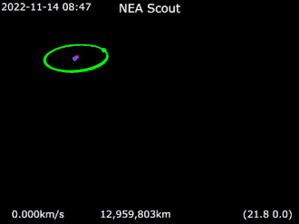 The Near-Earth Asteroid Scout (NEA Scout) was a mission by NASA to develop a controllable low-cost CubeSat solar sail spacecraft capable of encountering near-Earth asteroids (NEA).[5][6] NEA Scout was one of ten CubeSats launched into a heliocentric orbit on Artemis 1, the maiden flight of the Space Launch System, on 16 November 2022.[3][7]