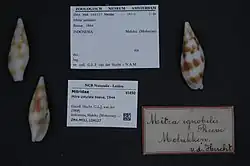 - ^ Mitra ustulata (Reeve, 1844). Retrieved through: World Register of Marine Species on 11 December 2018.