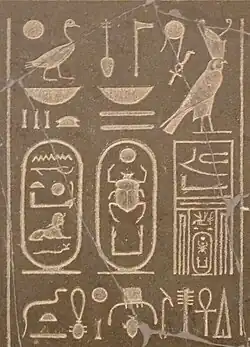 Nectanebo's Egyptian personal name was Nḫt-nb.f (Nakhtnebef), which means "the strong one of his lord". Greek sources rendered the name as Νεκτάνεβις (Nectanebis). The writings of Manetho which have been preserved by George Syncellus spell it Νεκτανέβης (Nectanebēs), but this is probably only based on a phonetic approximation due to iotacism.[4] Although convention in English assigns identical names to him and his grandson, Nectanebo II, the two in fact had different names.[5]