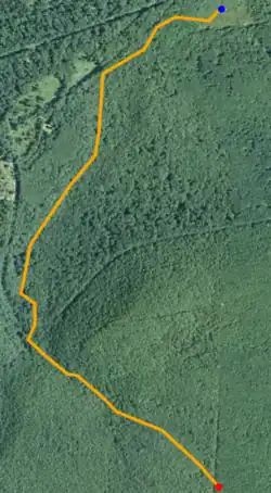 Satellite map of Negro Hollow. The red dot is the stream's source and blue dot is its mouth. | |