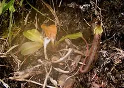 Nepenthes fusca is most commonly found as an epiphyte in shady mossy forest on ridge tops, where it may grow 10 to 15 m off the ground.[8] This makes it particularly difficult to find and often the only evidence of its presence are dead pitchers that have fallen to the forest floor.[22][23][24] In this respect, it can be considered the "ecological equivalent" of N. bongso from Sumatra.[25] More rarely, N. fusca grows terrestrially in exposed sites near montane forest[6] or along logging roads.[8] It is often sympatric with species such as N. reinwardtiana, N. stenophylla, and N. tentaculata,[26] and natural hybrids with all of these have been recorded.[8][12]