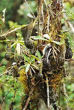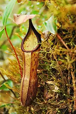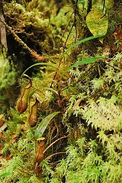 The typical habitat of this species is summit scrub vegetation as well as lower and upper montane mossy forest.[6][7] It always grows terrestrially, often in open sites such as ridge tops and cliff sides, where it is exposed to direct sunlight.[6] The species is rare in blangs, where the lack of surrounding vegetation means the stems scramble along the ground.[6] Nepenthes mikei may be difficult to find on Mount Pangulubao,[14] where it is sympatric with N. gymnamphora (N. xiphioides), N. ovata, and N. spectabilis.[2] On Mount Bandahara, where it is common above 2400 m,[6] it grows alongside N. diatas.[15] Natural hybrids with all of these species have been recorded.[6] At another location, which is undisclosed for conservation purposes, N. mikei grows alongside N. flava.[16]