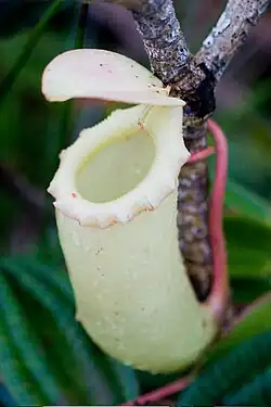 Pitchers arise from the end of the tendril, forming a tightly appressed curve. Lower pitchers are ovate to infundibuliform in shape[2] and may be up to 26 cm high and 15 cm wide.[7] A pair of ribs runs down the front of the pitcher, sometimes bearing fringe elements (≤3 mm wide) near the peristome. The pitcher mouth is oval and has an almost horizontal to slightly oblique insertion. The peristome is cylindrical, usually elongated into a short neck, and up to 20 mm wide. It bears a series of ribs (≤1 mm high) spaced 2 mm apart. The teeth lining the inner margin of the peristome are up to 4 mm long.[2] The inner portion of the peristome accounts for around 54% of its total cross-sectional surface length.[8] The glandular region covers the entire inner surface of the pitchers;[2] there is no waxy zone.[8] The glands are up to 0.8 mm in diameter and occur at a density of 200 to 500 per square centimetre. The lid or operculum is broadly ovate-cordate and up to 8 cm long and 6.5 cm wide. It has a rounded apex and lacks appendages. A number of ovate glands (≤1 mm in diameter) are concentrated near the centre of the lid's lower surface. A filiform spur (≤3 mm long) is inserted near the base of the lid.[2]