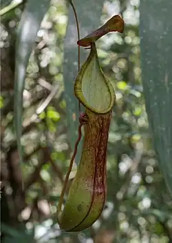 The describing authors wrote that, based on its pitcher morphology, N. talaandig "is not directly related to any other Philippine species", though they suggested it might belong to the large "N. alata group".[1] This complex includes N. alata, N. ceciliae, N. copelandii, N. cornuta, N. extincta, N. graciliflora, N. hamiguitanensis, N. kitanglad, N. kurata, N. leyte, N. mindanaoensis, N. negros, N. ramos, N. saranganiensis, and N. ultra.[1][2][3][4][5] These species are united by a number of morphological characters, including winged petioles, lids with basal ridges on the lower surface (often elaborated into appendages), and upper pitchers that are usually broadest near the base.[2][3]