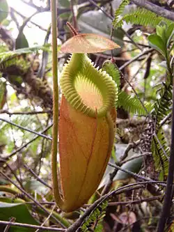 The hybrid is generally intermediate in appearance between its parent species. Raised ribs line the inner edge of the peristome and end with elongated teeth. These are more prominent than those found in N. rajah and smaller than those of N. villosa. The peristome is coarse and expanded at the margin (but not scalloped like that of N. rajah), the lid orbiculate or reniform and almost flat. In general, pitchers are larger than those of N. villosa and the tendril joins the apex about 1–2 cm (0.4–0.8 in) below the leaf tip, a feature which is characteristic of N. rajah.[38] In older plants, the tendril can be almost woody. N. × kinabaluensis is an indumentum of villous hairs covering the pitchers and leaf margins, which is approximately intermediate between the parents. Lower pitchers have two fringed wings, whereas the upper pitchers usually lack these. The colour of the pitcher varies from yellow to scarlet. N. × kinabaluensis seems to produce upper pitchers more readily than either of its parents. In all respects N. × kinabaluensis is intermediate between the two parent species and it is easy to distinguish from all other Nepenthes of Borneo. However, it has been confused once before, when the hybrid was misidentified as both N. rajah and N. villosa[39] in Letts Guide to Carnivorous Plants of the World, published in 1992.[14]