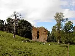 Only three walls still survive, reaching a height of about 12 metres (39 ft), with the east wall being completely ruined to ground level. The existing structure appears to have measured about 10 metres (33 ft) by 8 metres (26 ft), with walls of about 1.2 metres (3.9 ft) thick. It is thought that the tower rose to a height of four stories, with an entrance situated at ground level on the northeast side of the building. This led into a vaulted cellar, studded with slit window apertures. Evidence suggests that access to the upper floors was gained by a staircase situated in the east wall.