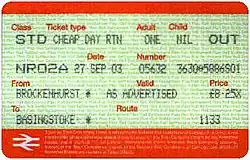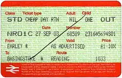 A larger and more controversial change occurred as from 2 June 2002,[4] when the discount level was changed: a minimum adult fare of £10.00 was imposed for weekday journeys, and children now received an 81% discount[5] on the full adult fare (equivalent to a 60% on the full child fare,[6] and subject to a minimum fare of £1.00) instead of the former £1.00 flat fare for all journeys. This meant that on a weekday, holders would receive no discount if the standard adult full fare was £10.00 or less, and a discount of less than 34% on fares between £10.05 and £15.00. Longer journeys for children would also become more expensive. Transport pressure group Transport 2000 and environmental organisation Friends of the Earth condemned the proposals,[7] and Reading East MP Jane Griffiths tabled an Early Day Motion in the British Parliament opposing the changes. This gained the support of 38 other MPs from all major parties.[7] Research commissioned by Transport 2000 indicated that 90% of journeys typically made in the railcard area would no longer gain any discount (as a result of the full adult fare being £10.00 or below), a further 3.5% would attract a discount of less than 34%, and only 6.5% would still be subject to the full 34% discount as before.[8] This reflects the fact that many journeys undertaken in the area are short and "local" in nature, and that the area as a whole is fairly small in size (as the map shows,[9] it does not extend a very long way from London in any direction).