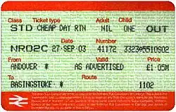 Adult tickets issued with the original Network Card displayed a status code of NSE, while child tickets showed CHNSE. These codes continued in use when the Network Railcard was introduced in its place, until the major change in June 2002. When the "new" Network Railcard was introduced, with the £10.00 minimum fare and altered child discount, there were still a large number of "old" Network Railcards in use, with no minimum fare restriction and £1.00 flat fares for children. A method of distinguishing these on tickets had to be developed. ATOC introduced the following codes accordingly,[11] and uploaded them to all ticket issuing systems in mid-2002: