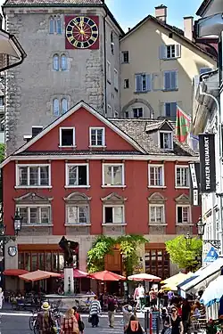Neumarkt was first mentioned in the city archives related to the sale of a house: Ulrich, the treasurer of the Probstei Zürich sealed and confirmed on 26 November 1311 that Mia, Gattin des [wife of] Werner Waltersbacher sold her slip of the pen of her endowment on a house...to Mechtild, Witwe von [widow of] Burkard Waltersbacher.[2] The former Neumarkttor or Kronentor gate at Seilergraben was built probably at the end of the 13th century, serving as gatetower, first mentioned in 1340 as Nünmargtsturm and since 1637 as Neumarktstor. The tower was also equipped in the 16th century with a clock and an ornate dial, but was broken in 1829.[3] The fountain in the square dates back to the 15th century. Its Jupiter stone fountain-sculpture from 1750 was vandalized in 1987 and the sculpture and its pedestal replaced in 1992 by a bronze sculpture (on a new stone pedestal) of the greek goddess of victory "Nike". And so the former Jupiter Brunnen (fountain) is now called the Nike-Brunnen.