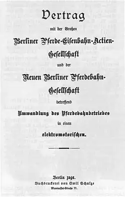 On September 10, 1895, Siemens & Halske launched Berlin's first electric tram line. The GBPfE, initially sceptical of the new system due to high investment costs, faced pressure to electrify. With the city approval agreement expiring in 1911, investments were necessary. This led to the “Electrification Agreement” between the City of Berlin, GBPfE, and NBPf, signed on July 2, 1897, and January 19, 1898. The agreement mandated electrification of both networks by the end of 1902, the merger of the two companies, approved additional lines, and extended operations until December 31, 1919.[4]