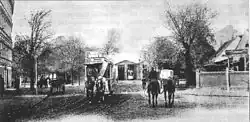 The first transport link for both areas was the Ringbahn, which began operating in 1871. However, Friedrichsberg station (now Frankfurter Allee) did not adequately cover the area, and Weißensee station (now Greifswalder Straße) was located outside the Weißensee municipal area in then-undeveloped land. To connect the area to Berlin, the transport company Weigel established a horse-drawn omnibus line from Alexanderplatz to Weißensee on November 1, 1873.[1]