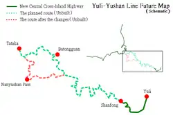 The Yuli-Yushan Line, or Yuli-Yushan Section, was planned to extend from Dongpu Mountain Pass westward to Yuli's town center in Hualien.[i][10][76][77][78] Initially planned at 102.7 km (7.1 km of existing roads upgraded, 95.6 km newly built), it was later revised to 122 km (7.2 km upgraded, 114.8 km newly built).[10][79] The route spanned Xinyi Township, Nantou; Taoyuan District, Kaohsiung;[j] and Zhuoxi and Yuli Townships, Hualien.[80] Planned to converge with the Chiayi-Yushan and Shuili-Yushan Lines at Dongpu Mountain Pass, construction halted after 14.6 km, leaving Dongpu Mountain Pass, now called Tatajia, as the junction of only the Chiayi-Yushan and Shuili-Yushan Lines.[4][8] Initially part of Taiwan Route 18, the completed section was reassigned to Taiwan Route 30 with the Yuchang Highway.[k][7][26][33][81][82]
