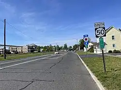 US 40 and Route 50 follow the Harding Highway, a two-lane undivided road, turning to the northeast and crossing the Great Egg Harbor River. Upon passing over the river, enters Mays Landing and turns north, encountering CR 617 before passing over an abandoned railroad line and heading into the downtown area of Mays Landing.[1][2] Here, the road crosses CR 559, and US 40 splits from Route 50 by turning east along that road.[1] Meanwhile, Route 50 continues north on Cape May Avenue, passing through developed areas.[2] It leaves Mays Landing and heads into back into forests. The route turns to the northeast, passing near the Clover Leaf Lakes residential development, before coming to a diamond interchange with US 322 (Black Horse Pike).[1][2]