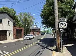 PA 179 begins at an intersection with US 202 in Solebury Township, Bucks County, Pennsylvania, heading east on two-lane undivided West Bridge Street through commercial areas. The road crosses into the borough of New Hope and passes near a shopping center and more businesses. Farther east, the route gains a center left-turn lane and enters more residential surroundings as it passes south of New Hope-Solebury High School. From this point, PA 179 loses the center left-turn lane and passes more homes. Upon crossing the New Hope Railroad at-grade south of New Hope station and crossing over the Delaware Canal, the route heads into the downtown of New Hope and intersects PA 32. PA 179 continues east as East Bridge Street to the New Hope-Lambertville Bridge over the Delaware River.[3][4]