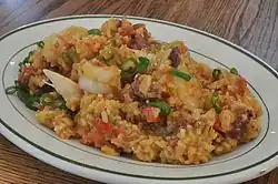 - Jambalaya—a dish of rice and meat (often a combination of andouille sausage, chicken, and shrimp) cooked with vegetables and Creole spices[31]