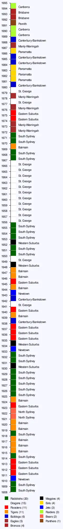 Between 1912 and 1925 the premiers were decided by first past the post. As a result of South Sydney's dominant 1925 season, the NSWRFL introduced a finals system in order to maintain interest in the competition.[2]
