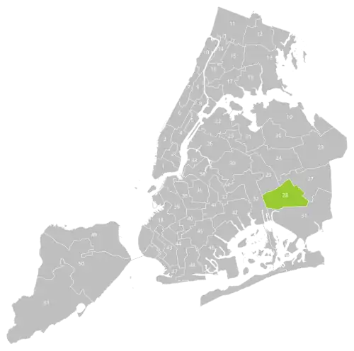 District 28 covers a series of predominantly Black neighborhoods in southeastern Queens, including some or all of Richmond Hill, Jamaica, South Ozone Park, and Rochdale Village.[4] Much of John F. Kennedy International Airport is located in the district, as is Baisley Pond Park.