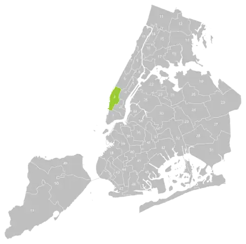 District 3 covers the Lower Manhattan neighborhoods of Chelsea, the West Village, Hell's Kitchen, Hudson Square, the Garment District, Flatiron, and parts of Greenwich Village, and Times Square.[4]