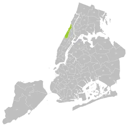 District 7 covers a series of small neighborhoods in upper Manhattan, including Hamilton Heights, Morningside Heights, Manhattanville, Manhattan Valley, and parts of Washington Heights and the Upper West Side.[4] Columbia University, Riverside Church, Grant's Tomb, Morningside Park, and the northern half of Riverside Park are all located within the district.