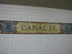 Many New York City Subway stations are decorated with colorful ceramic plaques and tile mosaics. Of these, many take the form of signs, identifying the station's location. Much of this ceramic work was in place when the subway system originally opened on October 27, 1904. Newer work continues to be installed each year, much of it cheerful and fanciful.[1][2]