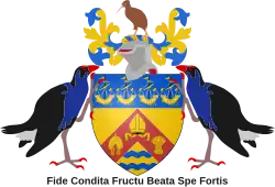 1949 | Escutcheon: Or on a chevron gules a mitre between a fleece and a garb of the first in base two bars wavy azure on a chief of the last four lymphads sails furled also of the first. Crest: On a wreath or and azure a kiwi proper. Supporters: On either side a pūkeko proper. Motto: Fide Condita, Fructu Beata, Spe Fortis ("Founded in faith, rich in the fulfilment thereof, strong in hope for the future") |