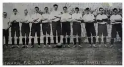 Its first match against an external side took place in January 1869, under the rugby football code, against Nottingham Forest. Newark had the advantage of Forest not knowing the rugby rules, but the match ended in a draw.[3] For the next season, the club adopted the association code, and its first recorded match under the FA laws was a 3–0 defeat to Notts County in November 1869, the heavier Newark side unable to cope with the speed of the County players; also not helped by Newark playing with 10 men against 12.[4] The club's experimentation with codes continued in December 1869, the club losing to Sheffield F.C. in a match played "to no particular rules", the Sheffield club not requiring strict adherence to the Sheffield code.[5]