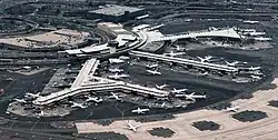 Through the early 1970s, Newark had a single terminal building located on the north side of the field by what is now Interstate 78.[41] A new control tower opened in 1960,[42] and the terminal was expanded from 26 to 32 gates in 1965.[43] A $200 million expansion of the airport, which was to include three terminals, began in 1967 after three years of planning.[44] In 1973, the airport was renamed Newark International Airport.[45] Former Terminal A and present Terminal B opened in 1973, although some charter and international flights requiring customs clearance remained at the North Terminal. The main building of Terminal C was completed at the same time, but only metal framing work was completed for the terminal's satellites. It would lay dormant until the mid-1980s, when, for a brief time, the western third of the terminal was readied for international arrivals and used for People Express transcontinental flights. Terminal C was then completed, and opened in June 1988.[46]