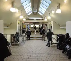 In 1981, the Metropolitan Transportation Authority listed the station among the 69 most deteriorated stations in the subway system.[8] Starting in the late 1980s or early 1990s, business owners in the adjoining shopping area began advocating for the station to be renamed after the mall.[9] The station and mall underwent reconstruction from 2009 to 2011. This included installation of yellow warning strips on the platform edges and repainting of the columns from red to green.[10] The renovation cost $30 million.[11] As part of the renovation of the station, it was renamed Newkirk Plaza in August 2011.[9]