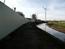 River Hull wharfage at Croda chemical plant, with 2008 wind turbine in distance (2011)