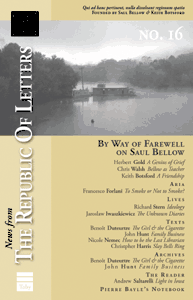 News from the Republic of Letters is the third magazine collaboration between Saul Bellow and Keith Botsford, following Noble Savage and ANON. The journal, originally based in Boston and later operated from the editor's home in Costa Rica, publishes new and newly discovered writings from American and international writers. The magazine appears twice a year. Readers can purchase one issue at a time or a subscription of four issues. It first appeared in 1997 in newsprint form. Issues between 2003 and 2008 were published as bound editions. The publication of No. 19 was printed by the London-based publisher Sylph Editions. The journal has returned to broadsheet format.