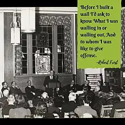 The Newtonville Branch Library, now the Newton Senior Center, is a significant contributing structure within the Historic District.[4] The largest of Newton's branch libraries, it was designed in the classical revival style by architect E. Donald Robb of Robb and Little. The central pedimented pavillon of the brick structure has a cupola rising above the third floor. Flanking on both sides are wings with large double-hung windows.[4] The stained glass medallions in the windows at the north and south gable ends of the original reading room were designed by Charles Jay Connick, a nationally known artist [5] and a Newtonville resident, living at 90 Hull Street. Poet Robert Frost, a friend of Connick's,[6][7] attended the dedication of the building in 1939 and read his poem Mending Wall, the opening line of which Connick incorporated into one of the windows.[8]