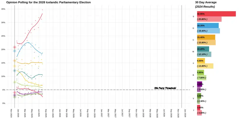 Maskína | 4–23 Jul 2025 | 1,855 | – | 31.2 | 18.0 | 16.2 | 6.6 | 9.9 | 6.8 | 2.9 | 5.0 | 3.4 | – | 13.2 |