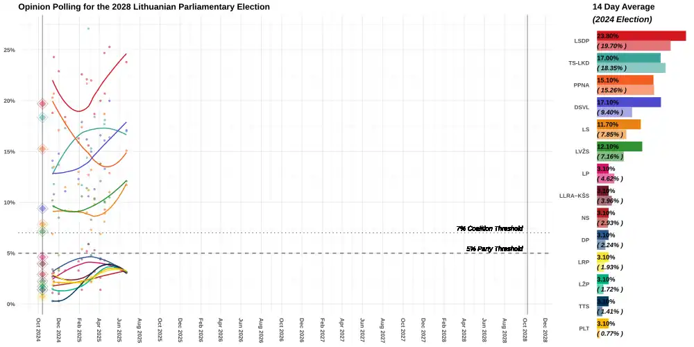 The next parliamentary elections in Lithuania are expected to be held on 8 October 2028, with a second round two weeks thereafter.[1]