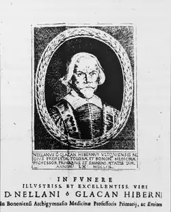 Niall Ó Glacáin[a] was born in Tyrconnell in the latter half of the sixteenth century.[7][2][11] Some historians give him a birth date of around 1563, owing to a 1653 engraving that gives his age as 90.[12][13] Professor Giorgio Scharpes estimated Ó Glacáin to be about 48 when recommending him to the University of Bologna in the 1630s, which would mean he was born in the 1580s.[14] Moreso, The Dictionary of Ulster Biography estimates Ó Glacáin's birthdate as 1590,[15] and other historians estimate it as 1600,[16][17] though Conall MacCuinneagáin has pointed out that as Ó Glacáin treated Hugh Roe O'Donnell in 1602, these birthdates are unlikely.[12]