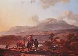 Born in Haarlem, he received instruction from his father Pieter Claesz, and from the painters Jan van Goyen, Pieter de Grebber, Jan Baptist Weenix, Jan Wils and Claes Cornelisz. Moeyaert.[1] According to Houbraken, Carel de Moor told him that Berchem got his name from two words "Berg hem" for "Save him!", an expression used by his fellows in Van Goyen's workshop whenever his father chased him there with the intent to beat him.[2] No trip or Grand Tour by Berchem was documented by Houbraken though he mentioned another story about the "Berg hem!" nickname which came from Berchem's conscription as a sailor; the man in charge of impressment knew him and sent him ashore with the words "Save him!".[2] Today his name is assumed to come from his father's hometown of Berchem, Antwerp.[3] According to the RKD he traveled to Italy with Jan Baptist Weenix, whom he called his cousin, in 1642–1645.[1] Works by him are signed both as "CBerghem" and "Berchem".[1]