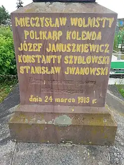 Following the Polish-Soviet War, Nieswiez became part of the Second Polish Republic, and two monuments, commemorating the rebellion, were built. One was located in the center of the town, and was destroyed during World War II. The other one was erected on March 24, 1926 at a local Roman Catholic cemetery, on the tomb of the five shot Polish leaders. The monument, which was founded by students and teachers of the local school, still exists. After 1944, the inscription pomordowani przez bolszewików ("murdered by the Bolsheviks") was removed by the Soviets from the tombstone.[1] After 1990, it was renovated.