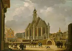 The church was designed by the architect Peter Noorwits,[1] assisted by the painter and architect Bartholomeus van Bassen. It is considered a highlight of the early Protestant church architecture in the Netherlands. Like many churches of the time, the New Church was designed as a central building. Unlike other central buildings, the church has no simple circular or multifaceted plan but there is a space of two octagonal sections connected by a slightly smaller section in which the pulpit was prepared. The Dutch Baroque architecture of the church shows elements of both Renaissance and Classicism. Two church bells, cast by Coenraat Wegewaert in 1656, hang in their original bell-chairs and measure 100,2 cm and 81,5 cm in diameter.[1] He also designed the clock.