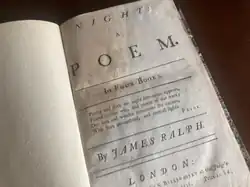 Night, a Poem in Four Books is a 1728 blank verse poem by the British writer James Ralph. Issued in quarto by the London printer J. Roberts, the work is organised in four books (≈1,100 unrhymed pentameter lines) that meditate on urban corruption, mortality and nocturnal imagery. Written during the brief vogue for descriptive blank verse inaugurated by James Thomson’s The Seasons, the poem attracted contemporary notice largely through Alexander Pope’s satirical allusion in the 1729 Dunciad Variorum. Modern critics treat Night both as an early graveyard-school text[1] and as a Whig political allegory of urban corruption.[2]