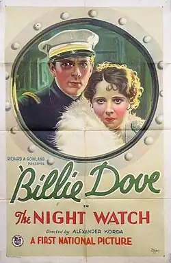 Night Watch is a 1928 American synchronized sound drama film directed by Alexander Korda and starring Billie Dove, Paul Lukas and Donald Reed. While the film has no audible dialog, it was released with a synchronized musical score with sound effects using the sound-on-disc Vitaphone process. The film was an adaptation of the dramatic 1921 play In the Night Watch, written by Michael Morton. The film is set almost entirely on a French warship at the beginning of the First World War.[2] Night Watch was the first of Korda's films to feature sound.[2][3]
