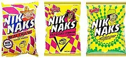 NikNaks, also known as "amaNikNaks,"[1] is the brand name for a popular[2] brand of South African Cheese puffs manufactured by the Simba Chips company since 1972.[3] Originally only coming in a "Cheese" flavour. It is normally sold in 55 gram and 135 gram bags, and is primarily made from maize, vegetable oil, salt and cheese.