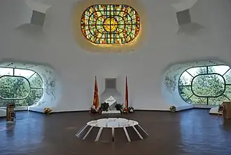 After World War II, the Kruševo Republic was promulgated as a historical predecessor of the new Socialist Republic of Macedonia by the Macedonian historiography. The focal point in the establishment of socialist continuity with the events of 1903 was Karev because of his socialist views.[38][39] His name was part of the anthem of SR Macedonia: "Today over Macedonia." However, later it was removed without an official explanation.[40][41] On August 2, 1948, a plaque was unveiled on his house, and a statue was erected in 1952. In 1953, on the 50th anniversary of the Ilinden Uprising, Karev's remains were transferred to his hometown Kruševo from the village of Rajčani where he was buried in 1905.[42] However, there was no reinterment and his remains were placed in the storage of the town's historical museum. According to anthropologist Keith Brown, this decision may have been result of the suspicion of Bulgarian baggage in Karev's legacy by the communist leaders in this period, despite the efforts to commemorate him.[43] Nevetheless, by the 1960s his name was firmly acclaimed. In 1969 the Yugoslav leader Josip Broz Tito paid tribute by laying a wreath on Karev's statue. In April 1990, his remains were ceremonially transferred to a sarcophagus placed in the Ilinden Uprising memorial, in the presence of Karev's family and representatives of the government.[23]